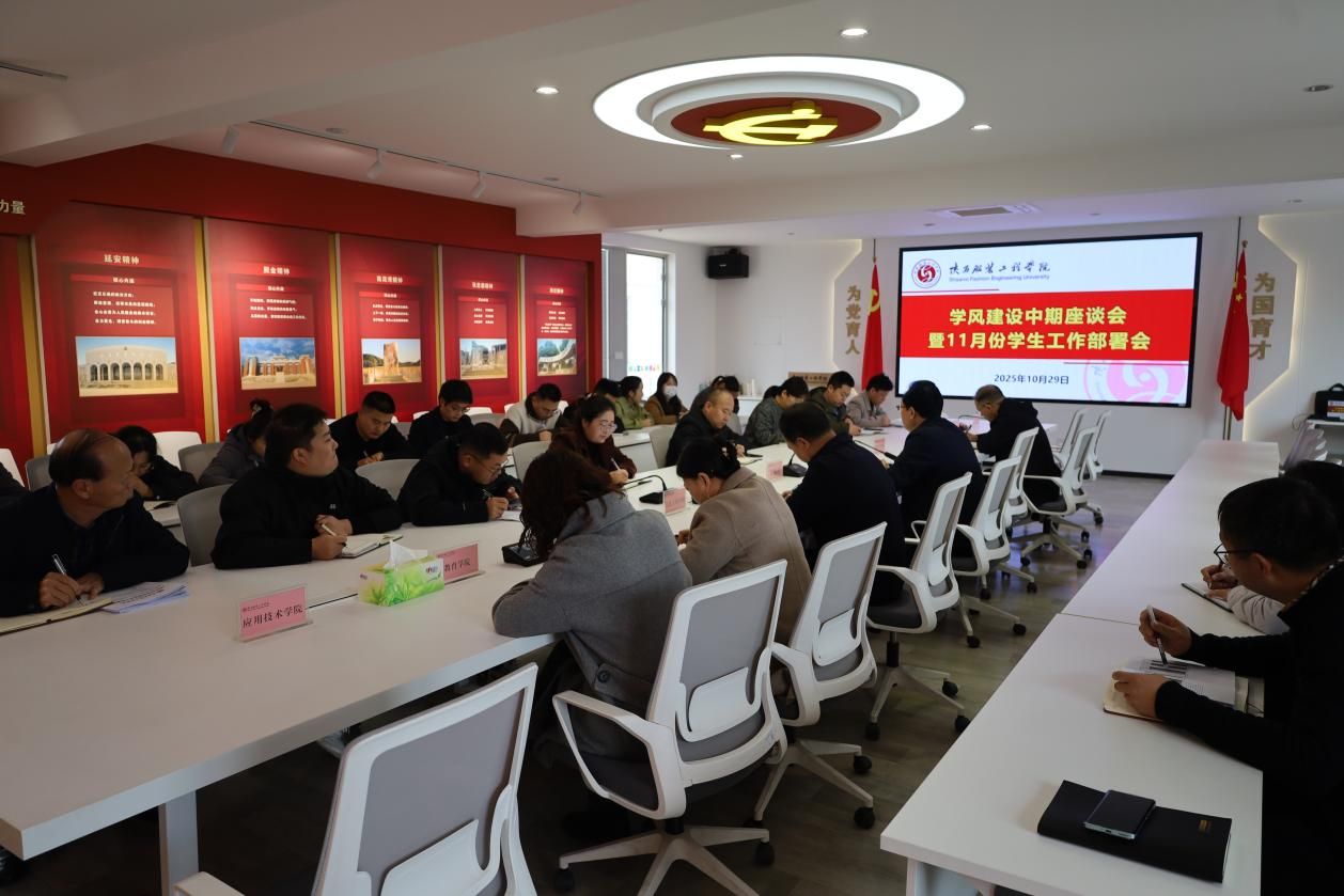 陕服新闻网讯(张维峰)为扎实推进“涵养学习志趣 赋能职业未来”学风建设主题月活动,总结阶段成效、梳理存在问题、部署下一阶段工作,10月29日上午,学校在行政中心326会议室召开学风建设中期座谈会暨11月份学生工作部署会。党委副书记刘继兵主持会议并讲话。 刘继兵在讲话中指出,当前学风建设月已进入中期攻坚、提质增效的关键阶段。他充分肯定各学院在思想引领、教风带动、管理细化和环境育人等方面取得的初步成效,同时也指出了工作中存在的薄弱环节与突出问题,...