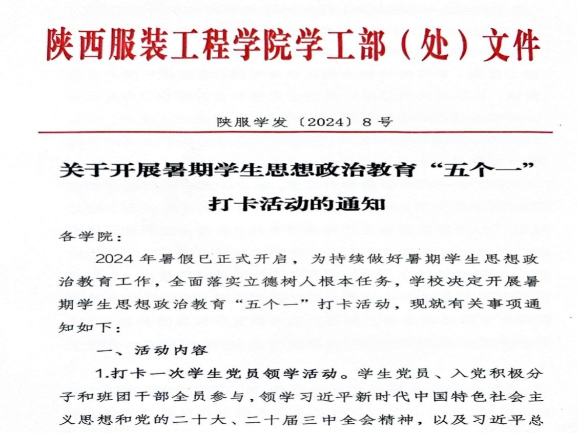 陕服新闻网讯(张维峰)为落实立德树人根本任务,强化大学生思想政治引领,塑造新时代青年大学生新形象,今年暑假期间,我校组织开展了学生思想政治教育“五个一”打卡活动:即打卡一次学生党员领学活动、打卡一次宪法卫士行动计划、打卡一次新学期学业规划、打卡一次名著书籍阅读活动、打卡一次志愿服务实践活动,秋季开学后经过班级、学院层层交流分享、汇报总结,“五个一”打卡活动取得良好效果。