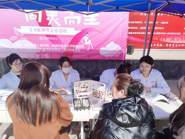 二是开展“芳华悦己,向美而生”三八义诊志愿服务活动、美容美形知识讲座。为进一步关爱女性,倡导健康生活方式,传播积极生活理念,增强女性自我保健意识,学校健康学院邀请陕西中医药大学附属医院的医生们,于3月7日共同举办“芳华悦己,向美而生”三八义诊志愿服务活动,并举办了“芳华悦己,向美而生”三八妇女节美容美形知识讲座。义诊活动分别包含了美容中医诊脉,美容整形咨询,美容养肤咨询和美甲,前来咨询的师生络绎不绝。