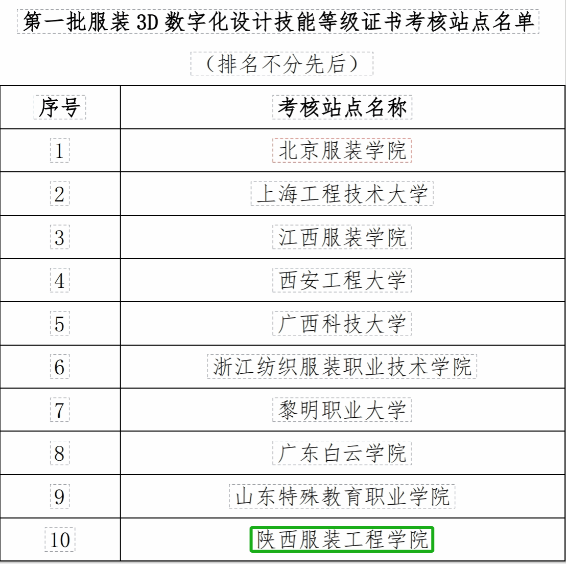 陕服新闻网讯(李文斌)近日,中国纺织服装教育学会公布第一批服装3D数字化设计技能等级证书考核站点名单,我校在列,成为西北五省区仅有的两家考点之一。