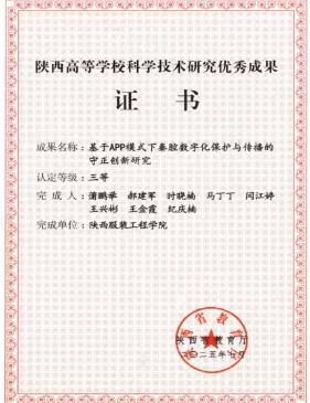 陕服新闻网讯(科技处)近期,陕西省教育厅公布了2025年陕西省高等学校科学技术成果奖获奖名单,我校蒲鹏举、郝建军、时晓楠、马丁丁、闫江婷、王兴彬、王金霞、纪庆楠申报的“基于APP模式下秦腔数字化保护与传播的守正创新研究”获得陕西省高等学校科学技术研究优秀成果三等奖。