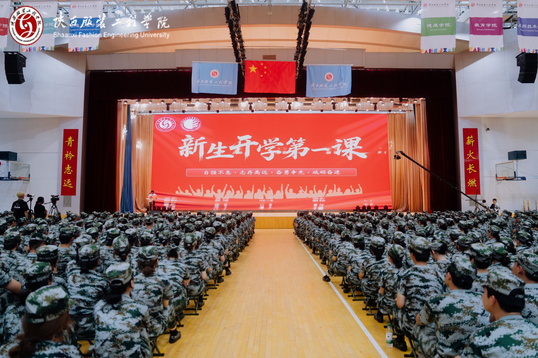 陕服新闻网讯(李文斌)9月1日下午,镐京集团所属陕西服装工程学院、陕西科技大学镐京学院师生齐聚陕服体育馆,开启2025级同学步入大学殿堂的“开学第一课”,开学第一课以“弘扬伟大抗战精神,担负时代光荣使命”为主题,具有深远的意义。镐京集团董事长董事局主席、陕西服装工程学院董事长、陕西科技大学镐京学院董事长吕明,陕西服装工程学院校长姜寿山、陕西科技大学镐京学院校长刘子建,两校校级领导、各二级学院领导、各职能部门负责人,军训团全体教官,2025级全体新生参加。陕西服装工程学院党委书记王岗主持。