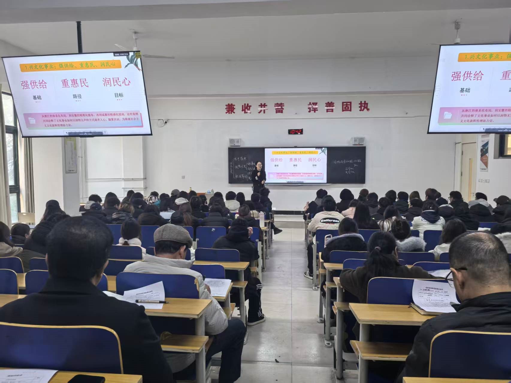 与会人员现场观摩了马克思主义学院郑媛媛老师主讲的《习近平新时代中国特色社会主义思想概论》示范课,课程以“让文化之花常开长盛”为题,系统梳理新时代铸就社会主义文化新辉煌的三维路径,紧扣课程重点,对标问题清单,回应学生关切,通过理论阐释、典型案例分析与互动问答等教学形式,有效引导学生深化对党的创新理论成果的理解。课堂气氛热烈,师生互动积极,展现出教师扎实的教学基本功。观摩人员全程认真听课,详细填写听课记录,全面记录教学过程、师生互动情况以及学生听课状态。