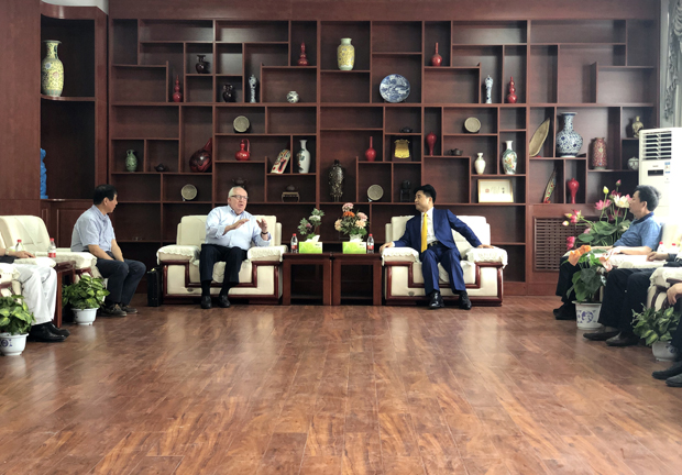 耶鲁大学终身教授罗伯特·布鲁克和与董事长吕明交谈