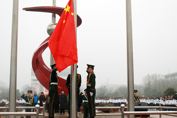 6点50分,迎着料峭的春风,在庄严的国歌声中,五星红旗冉冉升起。